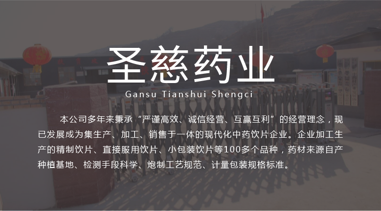 甘肅天水圣慈藥業(yè)有限公司成立于2016年11月8日,注冊資本500萬元,位于甘肅省天水市張川回族自治縣張川鎮(zhèn)中城南路,本公司多年秉承“嚴謹高效、誠信經(jīng)營、互贏互利”的經(jīng)營理念,現(xiàn)已發(fā)展成為集生產、加工、銷售于一體的現(xiàn)代化中藥飲片企業(yè)。企業(yè)加工生產的精制飲片、直接服用飲片、小包裝飲片等100多個品種,藥材來源自產種植基地、檢測手段科學、炮制工藝規(guī)范、計量包裝規(guī)格標準。